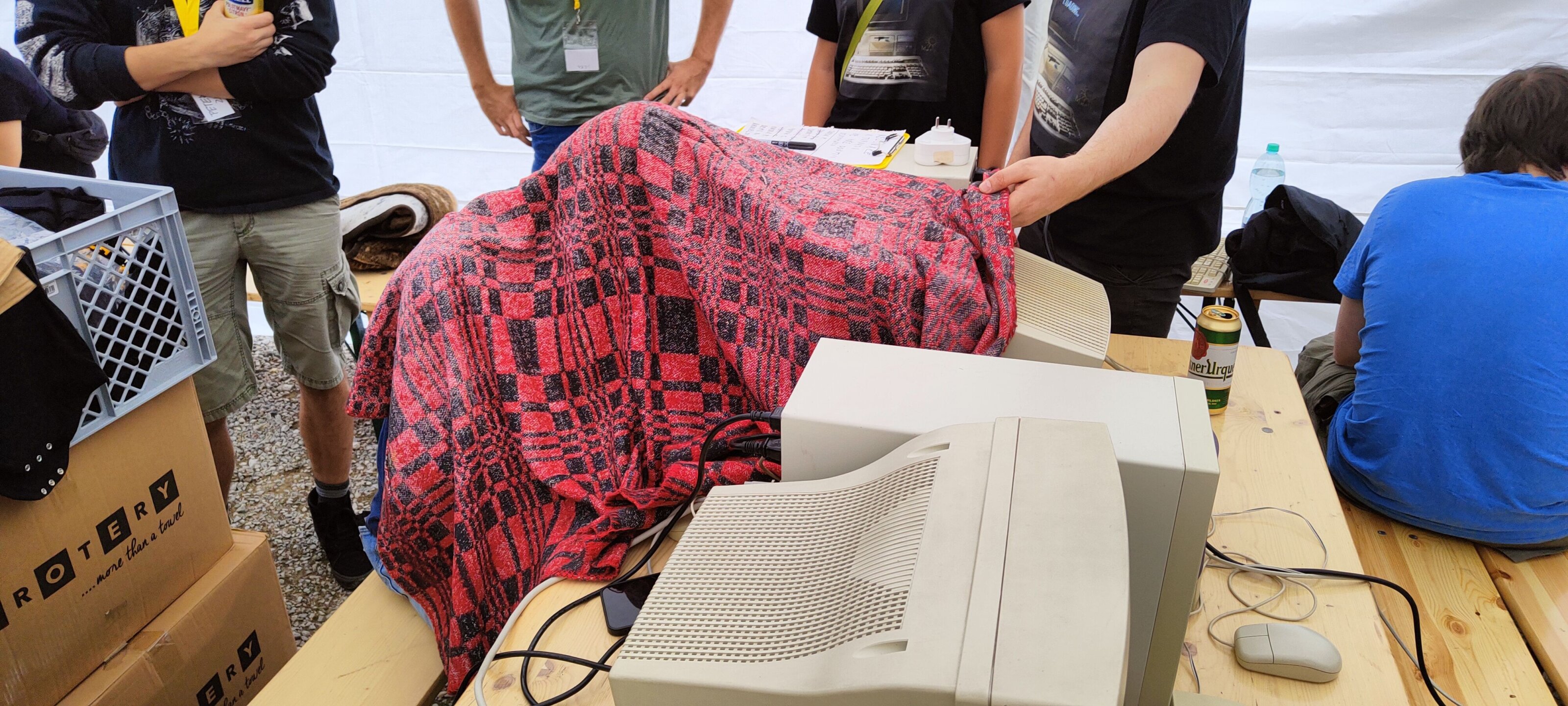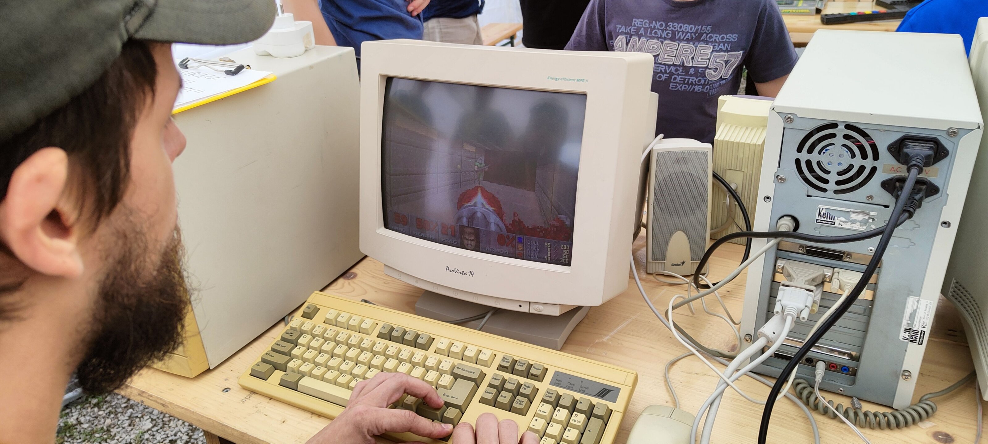 Paralelně k programu běžel také turnaj v 1v1 Doomu 2. U toho jsem vyhodnotil, že zůstanu pouze pozorovatelem, jelikož znám svoje kvality co se týče FPS. Nicméně hrálo se na dobových strojích a CRT monitorech. Tady se zprvu neblaze projevil fakt, že počítače byly umístěny v párty stanu, kde přemíra denního světla značně znemožňovala na monitorech cokoliv vidět. Tento neduh se nakonec elegantně vyřešil přehozením dek přes oba hrající soutěžící. Zima jim rozhodně nebyla. Jak jsem se následně dozvěděl od majitele, ta novější deka byla ještě o pár let starší než samotný Doom. Za počítači bylo ještě umístěno několik starých konzolí. Nejvíce pozornosti strhával pravděpodobně Vectrex a Nintendo Virtual Boy.
