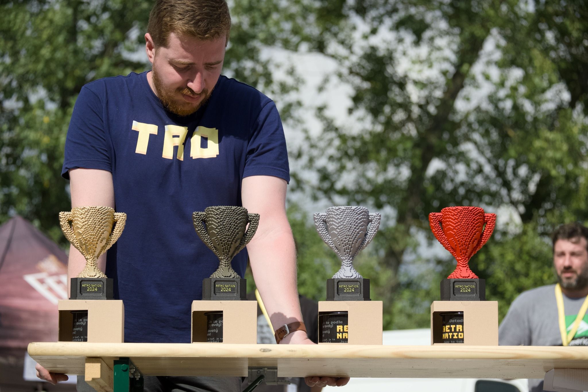Po další pauze nás čekalo vyhlášení prvních třech míst na automatech a prvního místa v Doomu. Vítězové si odnesli pěkné poháry z 3D tisku a plecháčky Retro Nation. Další ceny bylo možné získat v rámci tomboly. Objevil se tam RN merch - letošní i ten z minulých let, starý i moderní hardware a nějaký ten herní merchandise vztažený zejména k Armě.