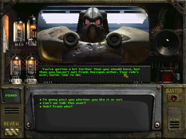 Pokud máte například vysokou řeč a slušné množství vědy, je docela snadné ho zabít, aniž byste se ho dotkli. Na rozdíl od původní hry však neexistuje žádná možnost kompletního překecání Franka, která by umožnila souboj zcela obejít, jako tomu bylo u Mastera, kterému jste prostě vysvětlili, že jeho rasa supermutantů nemá šanci na přežití, jelikož se nemůžou rozmnožovat. Master to prostě nedal, zhroutil se mu sen a spáchal sebevraždu.