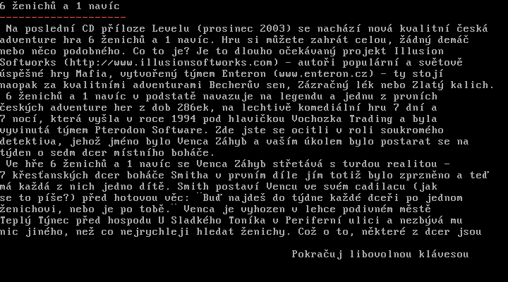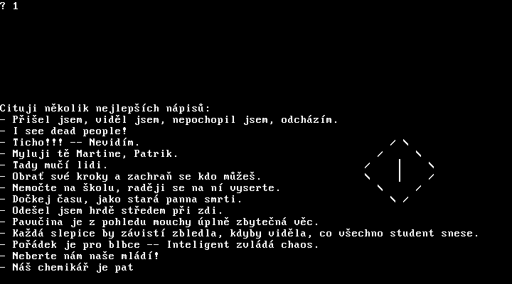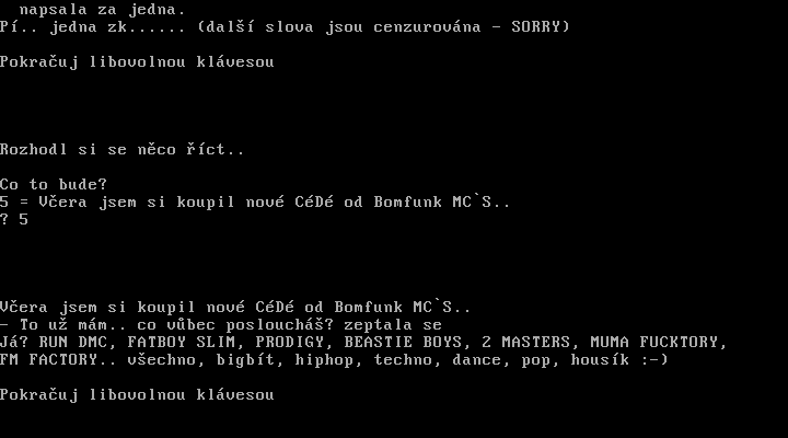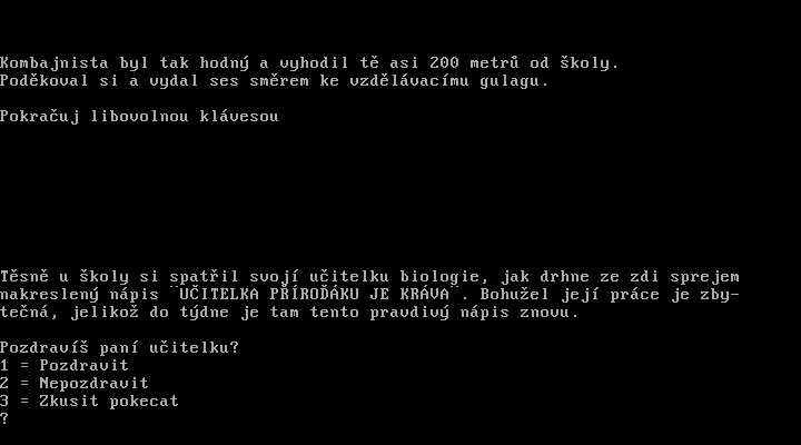 článek přečten a ihned zahrán první díl, díky :). kdysi sem taky něco bastlil v pascalu, jednu takovou minitextovku a pak eště jednu, kterou sem nedodělal. pravopisný chyby a pubertální (ne)humor, ale možná to příde vtípný jen mě z tý nostalgie :)