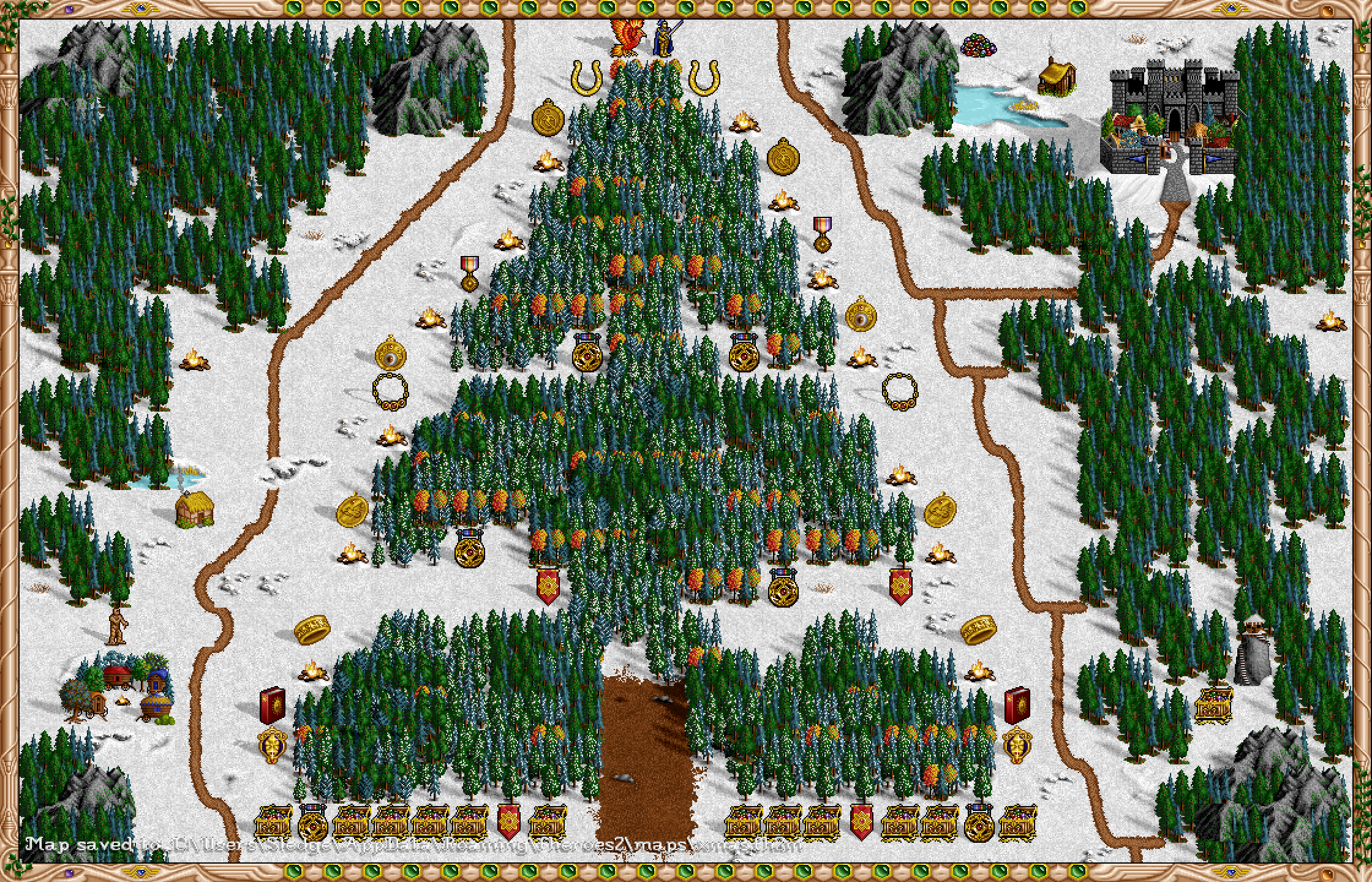 Nicméně při zkoumání možných směrů a cest mě osvítilo, výsledkem čehož je hrubě-pixelovaná a 256 barevná krása vložená níže. Ne, nejde o Rorschachův test, ten stromeček by tam měl být zjevný na první dobrou. Pokud snad není, omlouvám se, ale v rámci omezených možností, jak mých, tak možností editoru map z fHeroes2, jsem dělal co se dalo :)