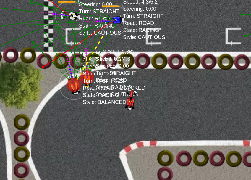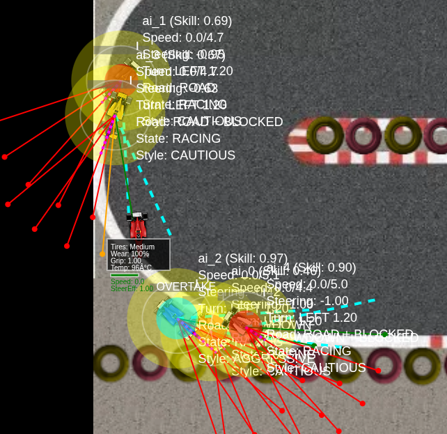 Tentokráte jsem se rozhodl, že oživím svou snahu o vytvoření 2D závodní hry z pohledu shora. Jak jsem již nastínil, tak prvotní pokus, kdy jsem ovládal své autíčko, které jezdilo po vytyčené trase, a při najetí do trávy zpomalilo, byl na světě celkem rychle. Postupně jsem ještě doladil zdi které nejdou projet a generují kolize, a byl jsem se základním konceptem celkem spokojen. Pak jsem ale došel k tomu, že potřebuji někoho, proti komu závodit. Nechal jsem tedy LLM vysmahnout první jednoduchý nástřel AI pro moje vozidla. Kupodivu to celé na první pohled vypadalo celkem dobře, a po prvotním "vajbkódování" a ladění s LLM jsem dosáhl celkem slušných výsledků a pokračoval v ladění sám. Došel jsem k tomu, že stačí celkem jednoduchý "radar", který vyšle paprsky v několika úhlech před auto, detekuje co je před ním, a vybere cestu s nejméně překážkami, a k té se poté snaží vydat.