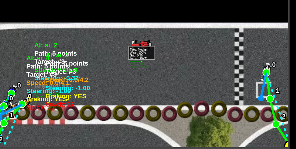 Zkusil jsem tedy ještě s LLM trochu podiskutovat o tom, že by zkusila implementovat pathfinding, který by predikoval trasu dostatečně dopředu, proložila křivku, a vozidlo se pak snažilo jí držet. Po několika pokusech, které často vedly k tomu, že se auto buď často vydalo v nekonečných kruzích, protože šířka trati to na plný rejd dovolovala, nebo se vydalo do protisměru či zvláštní slepé cesty, kdy to pathfinding spočítal hned po startu "plnou parou" proti zdi, to vypadalo tak beznadějně a otravně, že výsledky byly ve všech případech horší než jízda podle "radaru". Nakonec jsem tedy pokračoval v radarové metodě, a podařilo se ji dotáhnout dostatečně daleko na to, aby auta celkem pěkně jezdila po okruhu, a s rozšířenou predikcí zatáček opravdu odkroužila i 10 kol bez záseku.