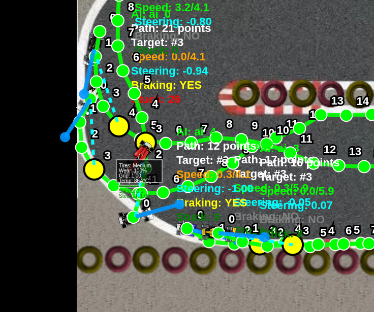 Celá tato optimalizace vedla k zásadnímu zlepšení, a auta již celkem pěkně sledují závodní linie. Bohužel to ale přineslo vedlejší efekt v tom, že se vrátil problém, který jsem řešil na začátku práce s komplexním pathfindingem - vozidla prostě často dojdou rekurzí k tomu, že když to nejde do zdi, je lepší se otočit a jet zpátky, nebo se prostě točit v kruhu. Na druhé straně pokud o nápravu tohoto chování tím, že se preferuje "přímější" cesta, zase často vede k tomu, že AI nedokáže vybrat ostřejší zatáčku, a tak v ní musí bourat a couvat i několikrát.