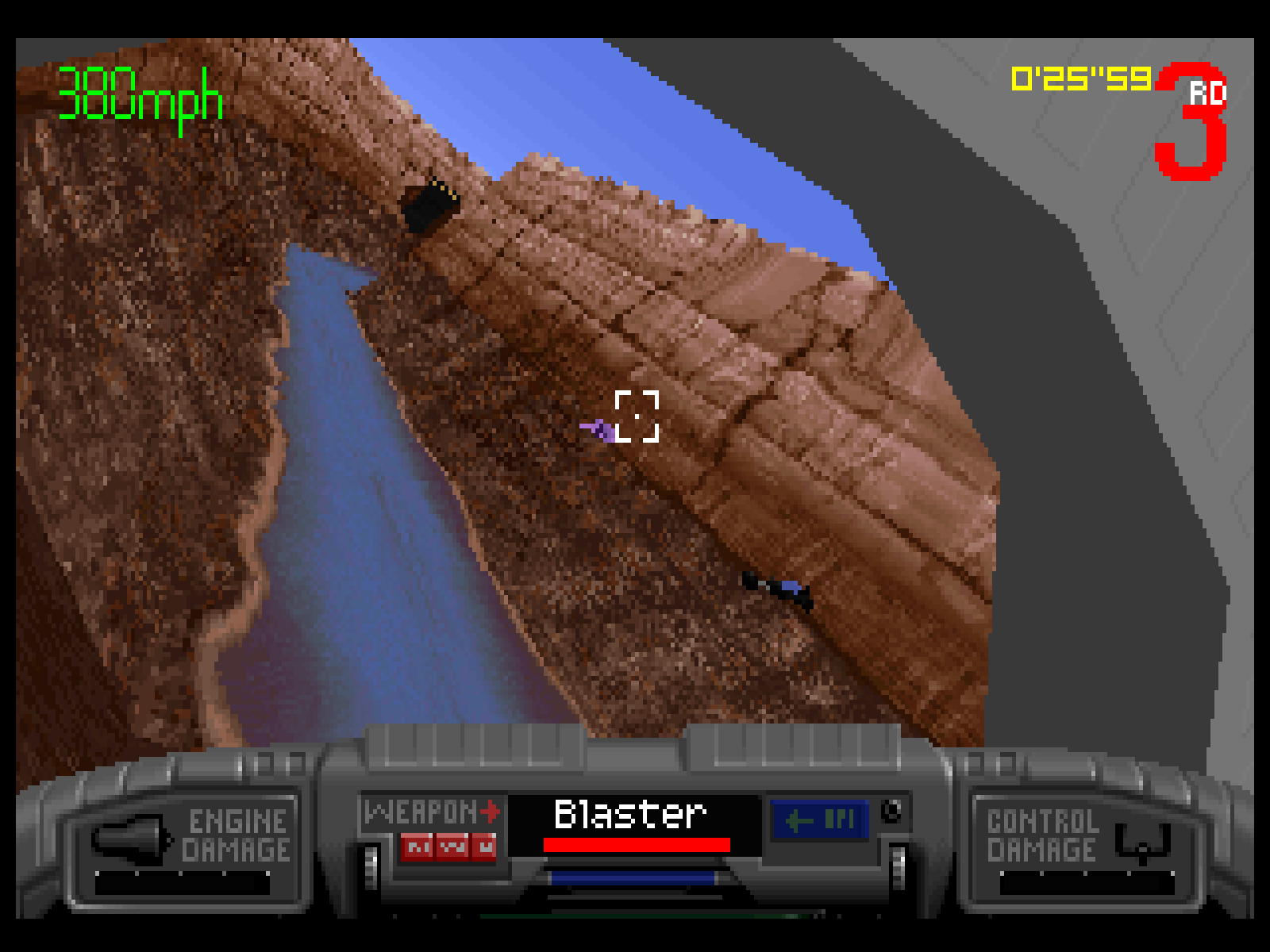 V popisku hry dále stojí, že vznášedla, kterých máme k dispozici celou desítku, pokud se tam tedy neschovávají ještě nějaká tajná a bonusová, je možné dále vylepšovat. Kromě závodění se oddáte i střelbě na pohyblivý cíl, antigravitační stroje jsou totiž ozbrojené, nicméně dát zrychlení na <space> a střelbu na <enter> značí, že programátor neměl všech pět závodníků pohromadě. (Aspoň tak to je tomu v demu, ze kterého jsou natípané okolní screenshoty.)