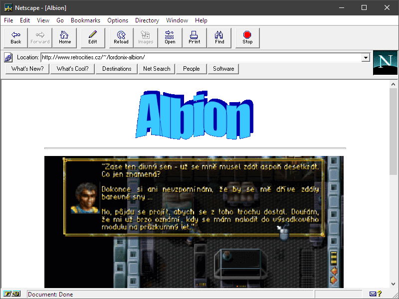 Poměrně netradiční přístup, kdy jsou obsahové texty vloženy do formulářového prvku, kam jsou po stisknutí tlačítka "pokračovat" načítány z jedné velké JavaScriptové proměnné. Možná narážka na současná řešení, kdy se podobné věci dějí běžně? V každém případě neotřelé, což chválím, stejně jako chválím samotný "jako 3D" nápis Albion. A vlastně i tohle řešení vystihuje ducha doby, kdy se zkoušelo všechno možné a to málo, co měl tvůrce webu k dispozici, bylo často ohýbáno do nepřirozených úhlů.