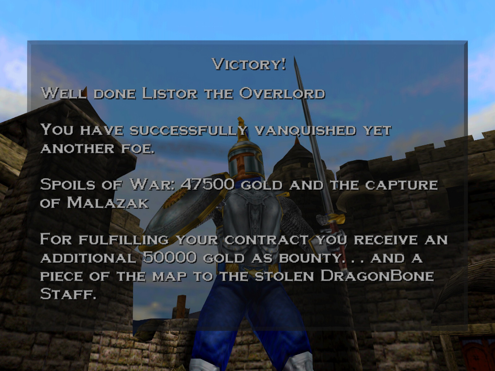 A to je v kostce kompletní náplň Quest for the DragonBone Staff. Běháte po světě, vybíjíte nepřátele, sbíráte truhly s poklady, najímáte armády, plníte kontrakty a po jejich splnění můžete požádat královnu o povýšení. V jedné z truhel najdete mapu dalšího kontinentu, kde na vás čekají větší poklady, silnější nepřátelé, lepší armády. A pak další kontinent. A pak kontinent finální, kde se utkáte se zmíněným Malazakem.