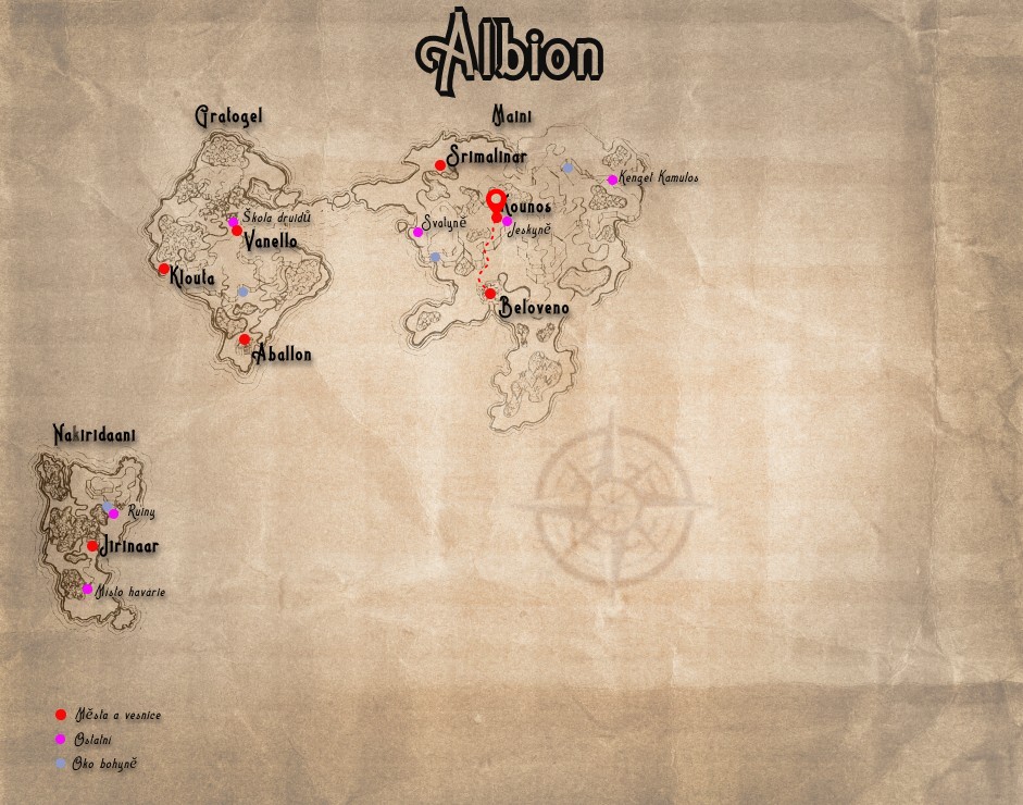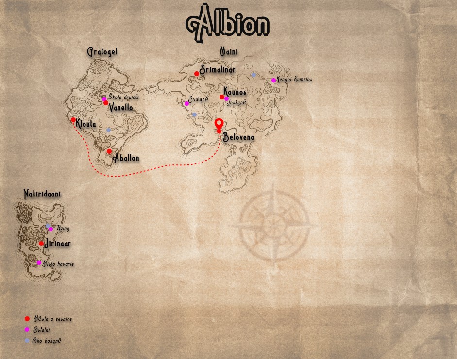 "Tady," ukázal. "Tady přistaneme. Beloveno. Je to přístavní město, lidské. Původní obyvatelé pocházejí z keltských osadníků, kteří kdysi dorazili na Maini. Na rozdíl od svých příbuzných z Gratogelu se postupně vzdali tradičního keltského způsobu života a dali přednost městskému prostředí, zejména v Belovenu. Je to… řekněme, tolerantní místo." Vzpomněl jsem si na Drirrovo vyprávění o nevěstinci a jen jsem mlčky přikývl, zatímco jsem udělal na mapě značku.