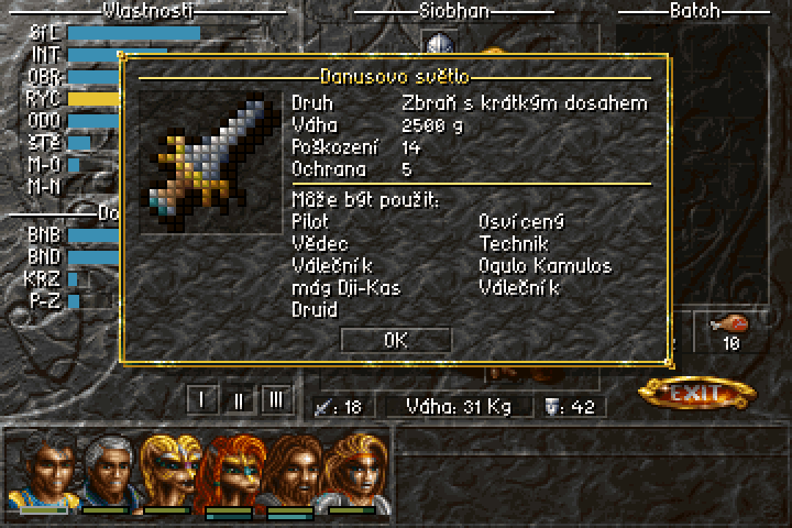Inventář se mi konečně uvolní a s penězi v kapse se pak vrhám na výběr nového vybavení. Pevnější brnění, ostřejší čepel a samozřejmě něco i pro Siobhan. Lepší zbraně a klidnější spaní. Co rozhodně stojí za útratu je meč; Danusovo světlo. Tenhle krasavec přidá dvacet bodů do rychlosti, deset do života, patnáct bodů do boje na blízko a kouzlo "životabudič". Navíc nemá žádné omezení podle třidy, ani rasy.