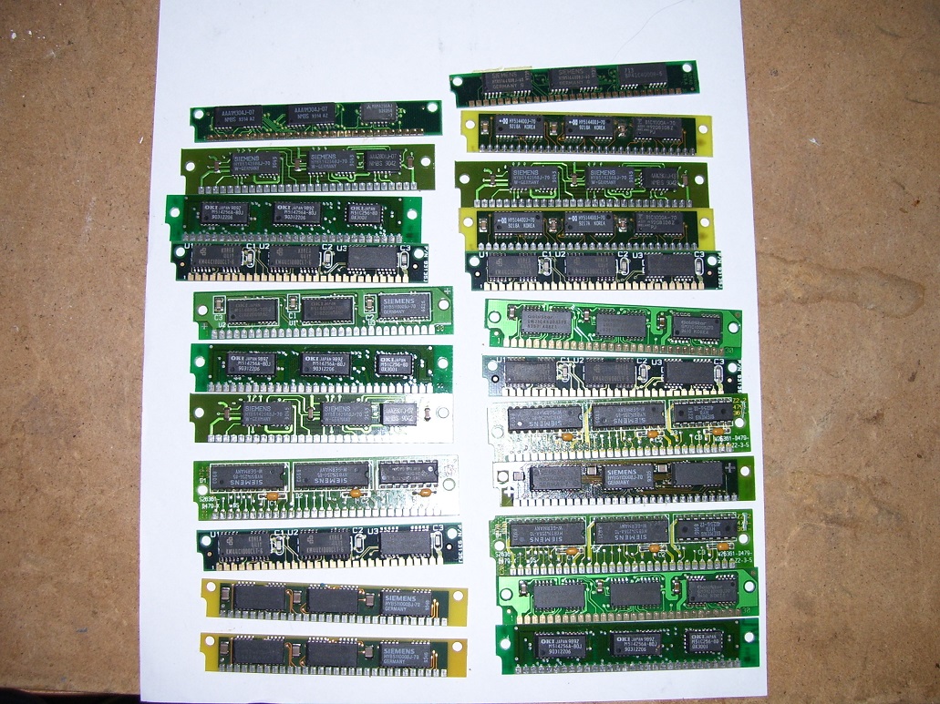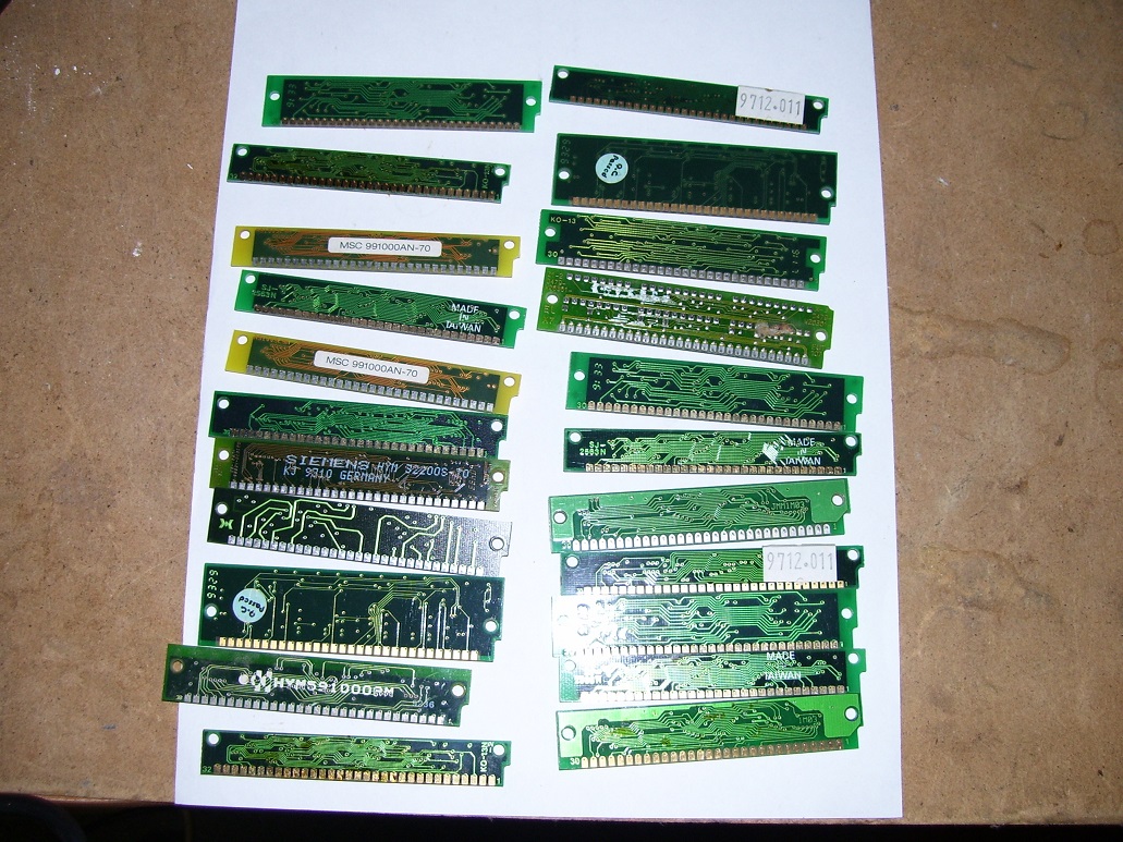 tak jsem nafotil téměř všechny 30 pin paměti, líc a rub, akorát se omlouvám je to zrovna po výhře našich na MS v hokeji v Moskvě a možná jsou trošku popletený fotky:/, bohužel všechno zmenšovat pro tento web mi dalo nějak zabrat. samozřejmě Vám všem mohu poslat foto v plném rozlišení při potřebě na email (bacha hrajeme i zítra). Případné jednotlivé fotky doplním podrobněji.