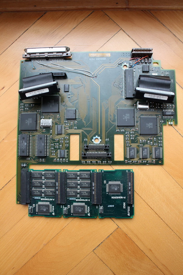 a tu uz doska v celku, ako vidno, vobec sa nejedna o dosku podobnu akemukolvek IBM PC, je tu uz vidno pokrocilejsiu technologiu, cipsety, takisto zaujimavo riesene pamate formou pridavnych malych adapterov na spodu.