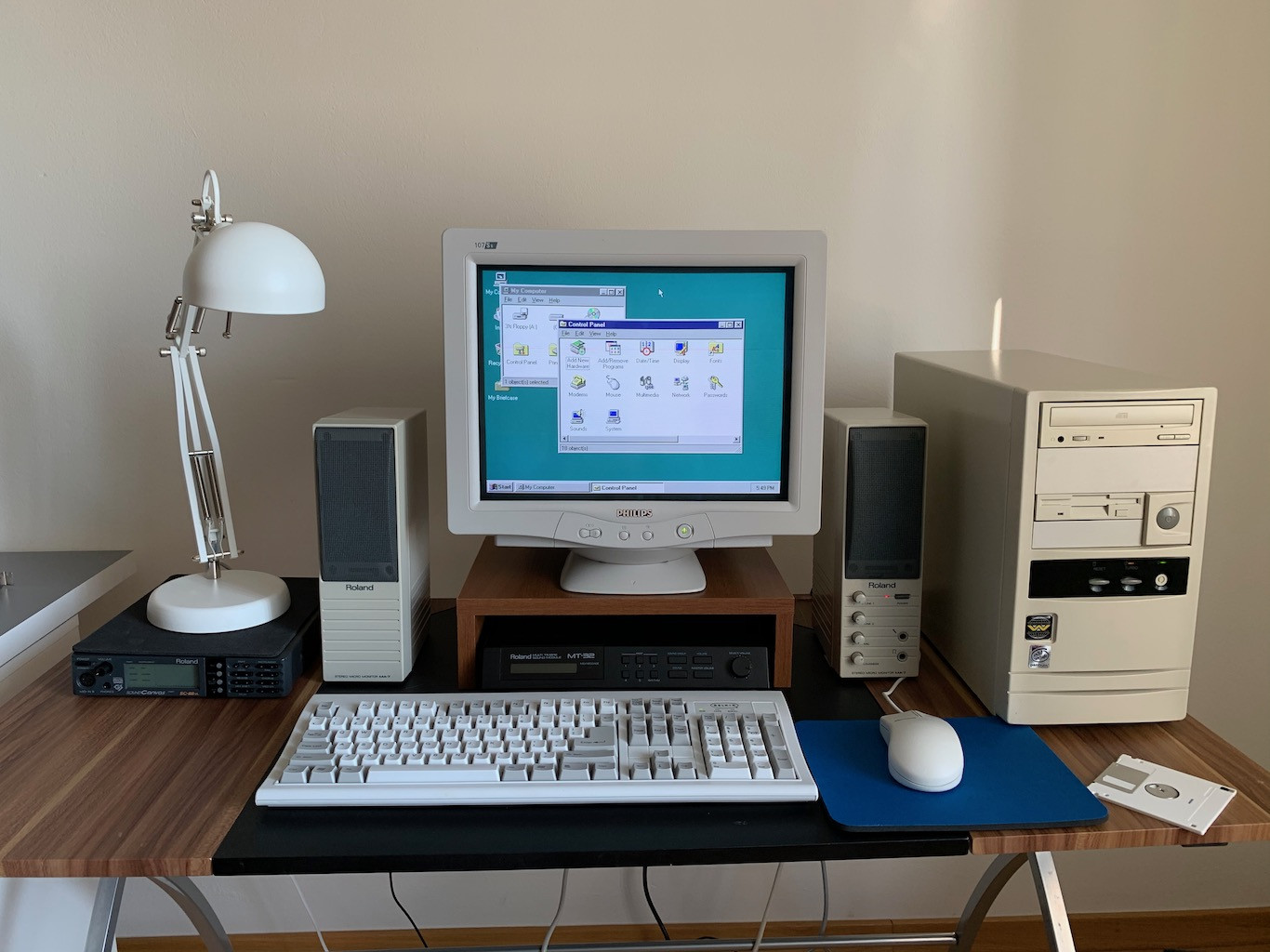 Takuto bednu som mal aj v 90. rokoch ako dieta. Akurat vtedy v tom bola 486 DX4 120. V tomto builde som pouzil P233 MMX pre lepsiu hratelnost neskorych DOS hier. Doska je nejaka obycajna TMC AI5TV s 64 MB RAM (overkill), S3 Virge/DX, Diamond Monster Voodoo 1, AWE 64 Gold, sietovka (nejaka Delta). V seriovom zapojeni je Roland SC-55 a Roland MT-32, reproduktory su Roland MA-7. Gulickova MS Serial Mouse 2.1. Klavesnica je zatial iba Dell "classic keyboard", je to nova klavesnica vyrobena niekedy v 21. storoci :-), len vyzera presne ako tie klasicke z 90. rokov. Namiesto HDD pouzivam IDE-to-SD adapter s 16GB SD kartou (funguje to bez problemov). CRT monitor je uz spominany 17" Philips 107S61 vyrobeny po roku 2000 s plochou obrazovkou. Subory budem pravdepodobne prenasat cez siet, spravim doma FTP server a z tohto pocitaca sa napojim (aby som sa nemusel babrat s file sharingom cez Windows a zaroven sa na FTP dostanem aj z DOSu).