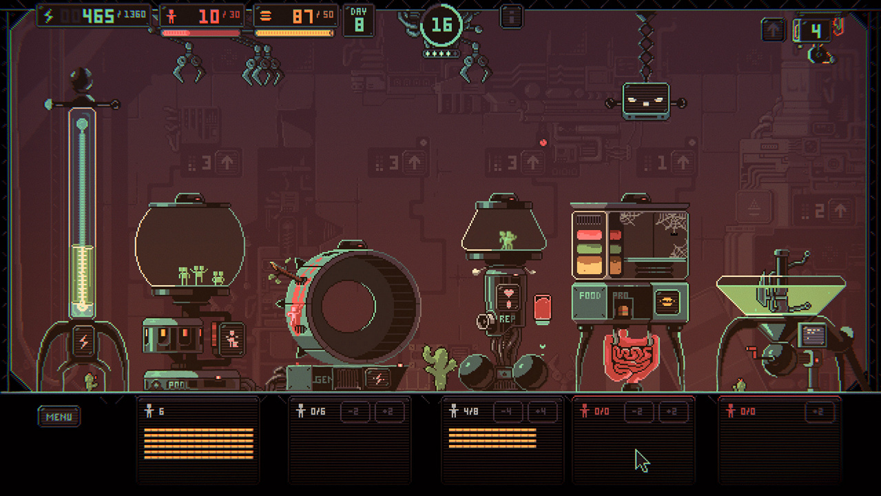 Jádrem hry je tedy správa rozličných mašinek a adekvátní distribuce zdrojů, tzn. pidižvíků (a teď se mi na mysl vloudili Lemmings). Ale pozor, nejde o odpočinkovou procházku postapo sadem, hra je rychlejší než čurací zastávka v nádražce, nic pro výbušné povahy, viz mnohé rozezlené komentáře. Ovšem ti, kteří vytrvají, budou odměněni humorem černým jak Fernet z téže nádražky, a rogue-lite elementy, které dělají z každé partičky jedinečný zážitek.
