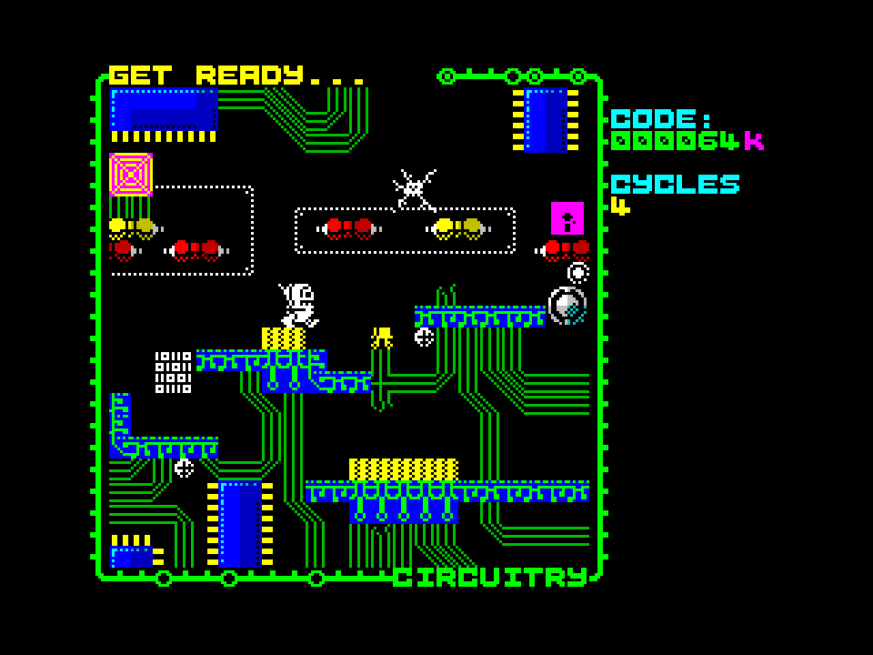 Ano, plošňákovka! To je prosím kreativní hra se slovy! Circuitry je nová hopsačka pro ZX Spectrum kompatibilní stroje. Vaším úkolem je v každé z úrovní posbírat datové nosiče a následně dohopkat k východu. V tom vám pochopitelně brání spousta verbeže, které se musíte umným časováním skoků a úskoků vyhýbat.