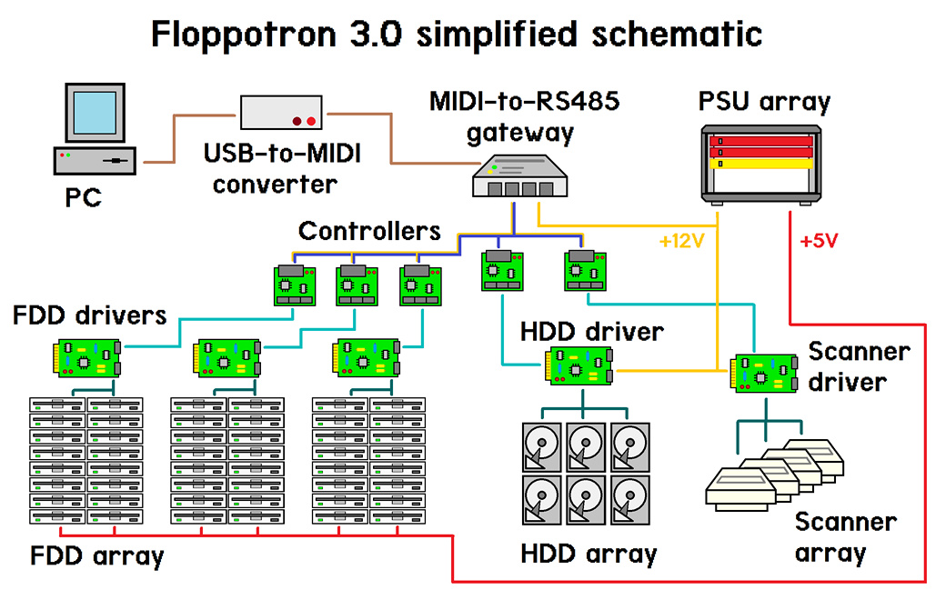 Zapomeňte na předchozí pokusy, nebo dokonce rozličné variace na stejný koncept. Vše bledne v porovnání s monstrem, kterým je nový The Floppotron 3.0. Ten obsahuje plných 512 disketových mechanik (třiapůlek), 16 pevných disků a 4 skenery. Plus spoustu podpůrné kabeláže, na míru stavěných komponent a pochopitelně i podpůrný software, bez kterého by Floppotron oněměl.
