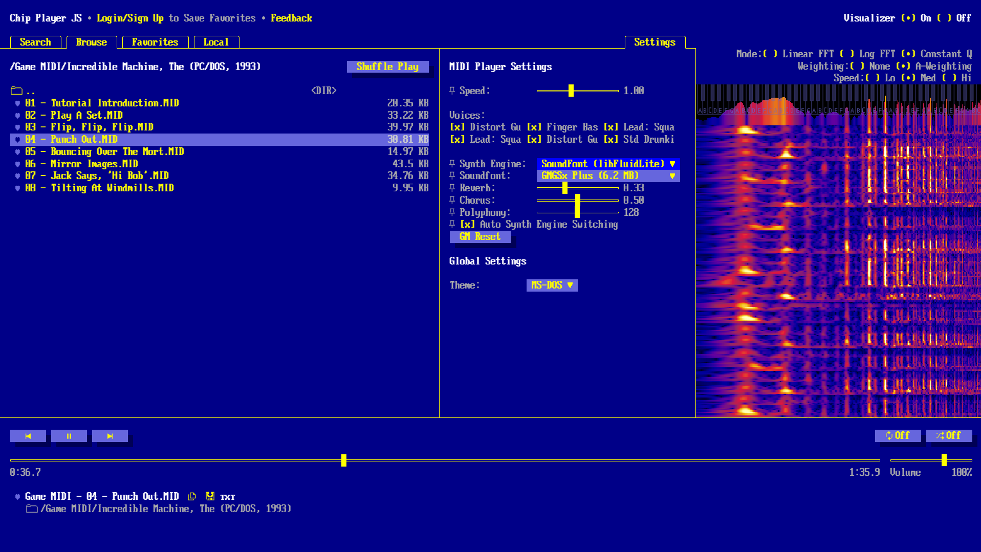 Takže si např. můžete otevřít složku /Game MIDI/Raptor, kde najdete *.MID verze hudby z této oblíbené sharewarové shmupky, a přes "Settings" okoštovat, jak by hra zněla na zařízeních Roland SC-55 či Yamaha DB50XG. K tomu můžete např. zahýbat s efekty "reverb" a "chorus", změnit tempo přehrávání apod. Dokonce můžete nahrát vlastní soundbanky ve formátu SF2, případně nasměrovat přehrávání na fyzické MIDI zařízení připojené k PC (přes Web MIDI API).