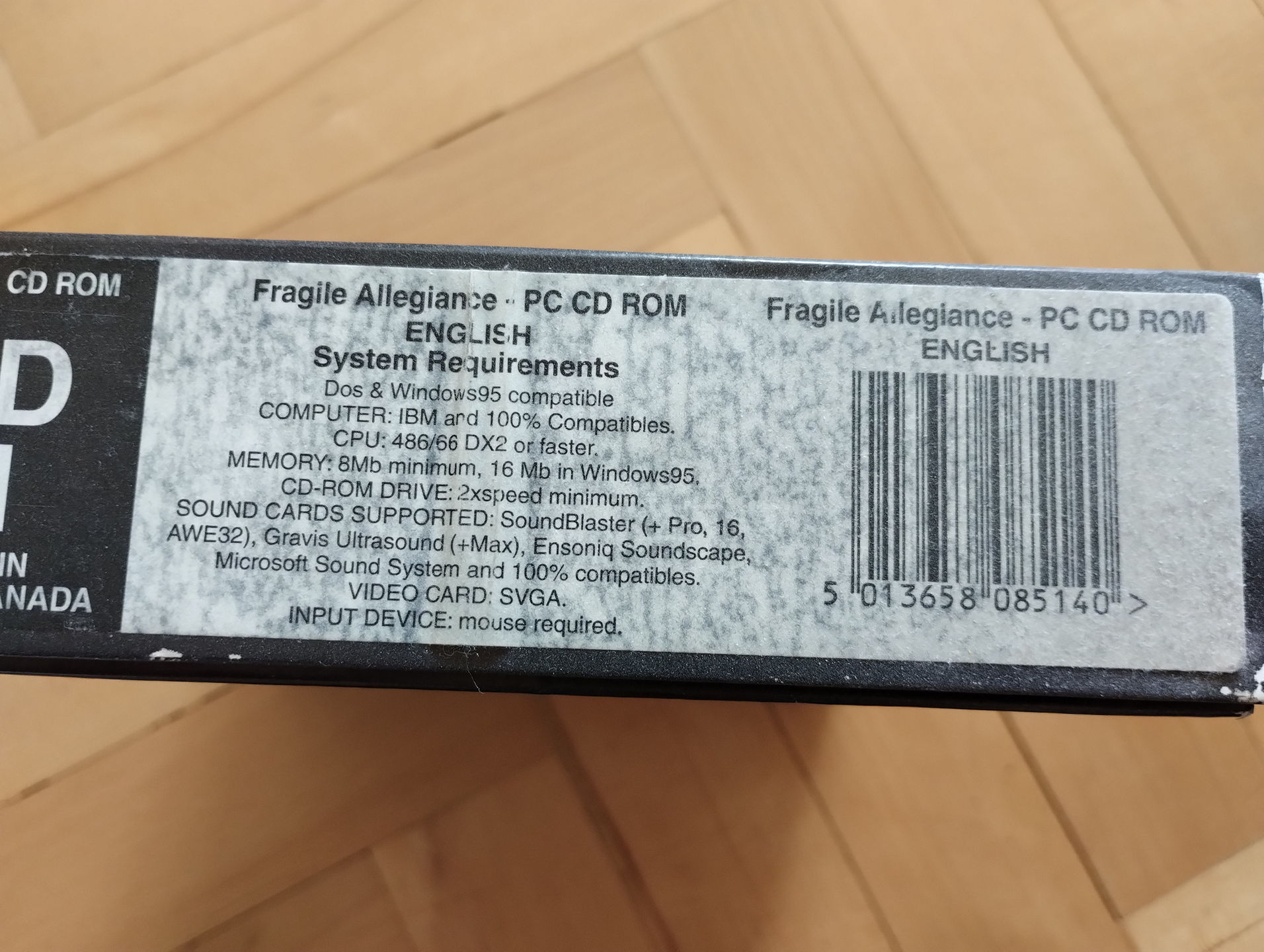 A aby to nebylo tak strohé, tak si společně aspoň povzdychněme nad minimálními požadavky - 486 DX2 / 66 MHz, 8MB RAM, SVGA karta, 2x CD-ROM mechanika, Sound Blaster kompatibilní zvukovka, DOS. Dokonalé, svým způsobem herní standard své doby... i když rok 1997, kdy Fragile Allegiance vyšla, už hlasitě volal po výkonnějším železe.