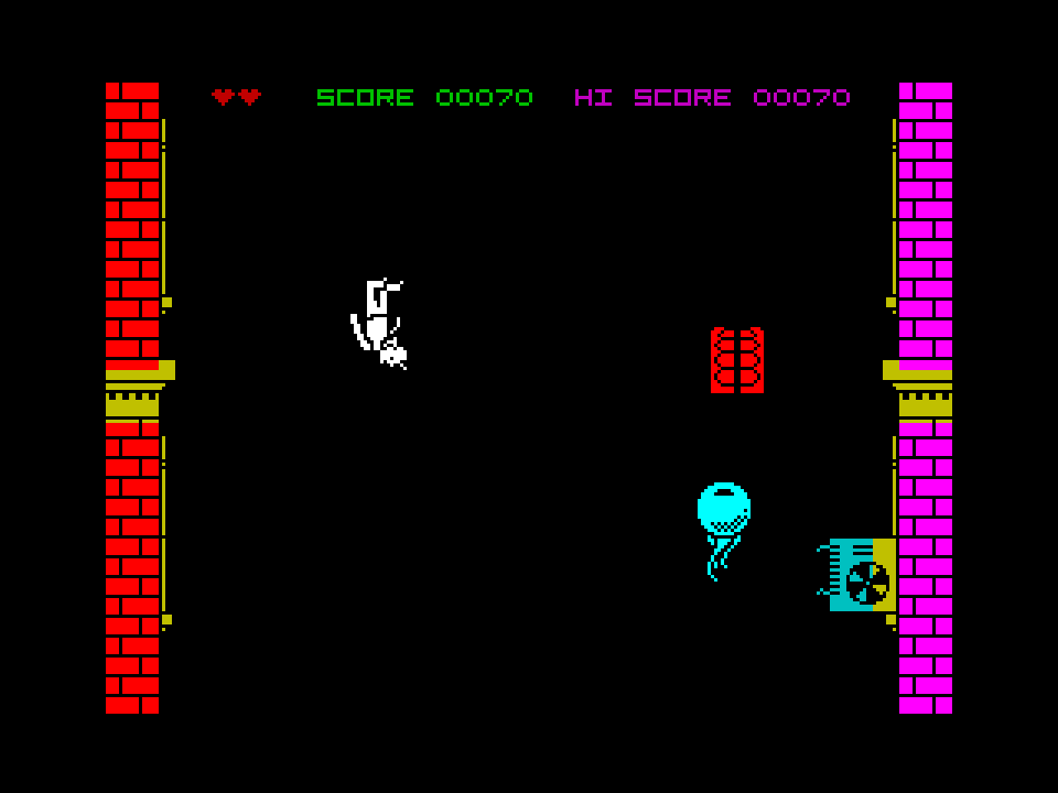 Nohzdyve je jednoduchá hříčka, ve které padáte střemhlav s úkolem posbírat co nejvíce... eh... očních bulev. Aby to nebylo tak snadné, je třeba vyhnout se zdem a ostatním objektům. Dá se to hrát, ale na ZX Spectru jste rozhodně viděli propracovanější kousky.