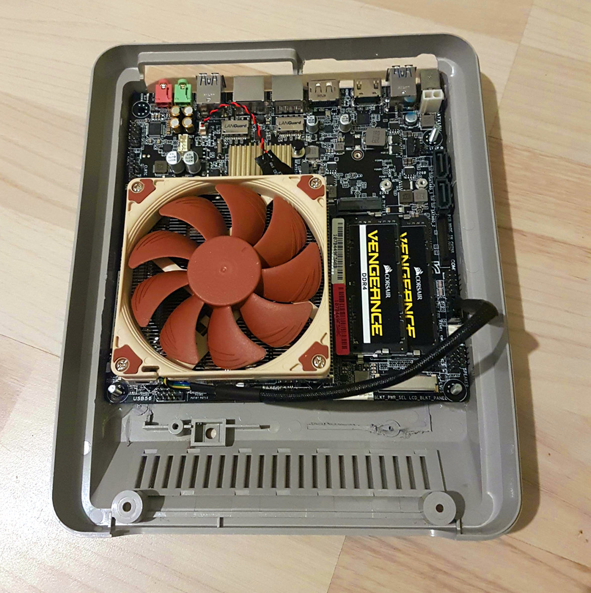 Projektů podobného druhu je samozřejmě nepočítaně, ovšem většinou se točí kolem počítače typu Raspberry Pi. V tomto případě ovšem tvůrce použil běžnou mini-ITX desku a do ní nainstaloval procesor Intel Core i5 7500. Což je výkonem daleko nad čímkoliv, co mohou nabídnout obvyklé ARMové desky. Kupodivu zbylo i místo na chlazení, o které se stará nízkoprofilový ventilátor Noctua NH-L9i ve spojení s malým ventilátorem odvádějícím teplo ven. Další parametry jsou: 32GB RAM (malinko overkill) a Transcend MTS600 M.2 SSD. To není zlé na takového drobka. Samozřejmostí jsou detaily typu svítící led a funkční power.