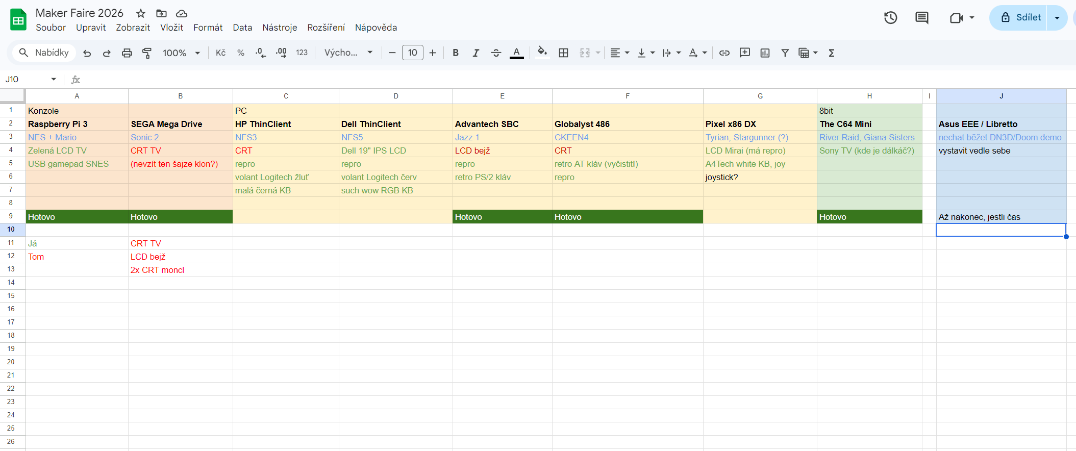 Jak to aktuálně vypadá se stavem exponátů si můžete prohlédnout na níže přiloženém screenshotu s mými chaotickými poznámkami. To nejtěžší už je doufám za mnou :) Seznam hardwaru a her samozřejmě není tesán do křemíku, stát se během těch dvou dnů plánování může cokoli. Konkrétně přemýšlím, že bych místo NFS zvolil nějaká trochu "opravdovější" auta, když už mám ten volant. Nápady?