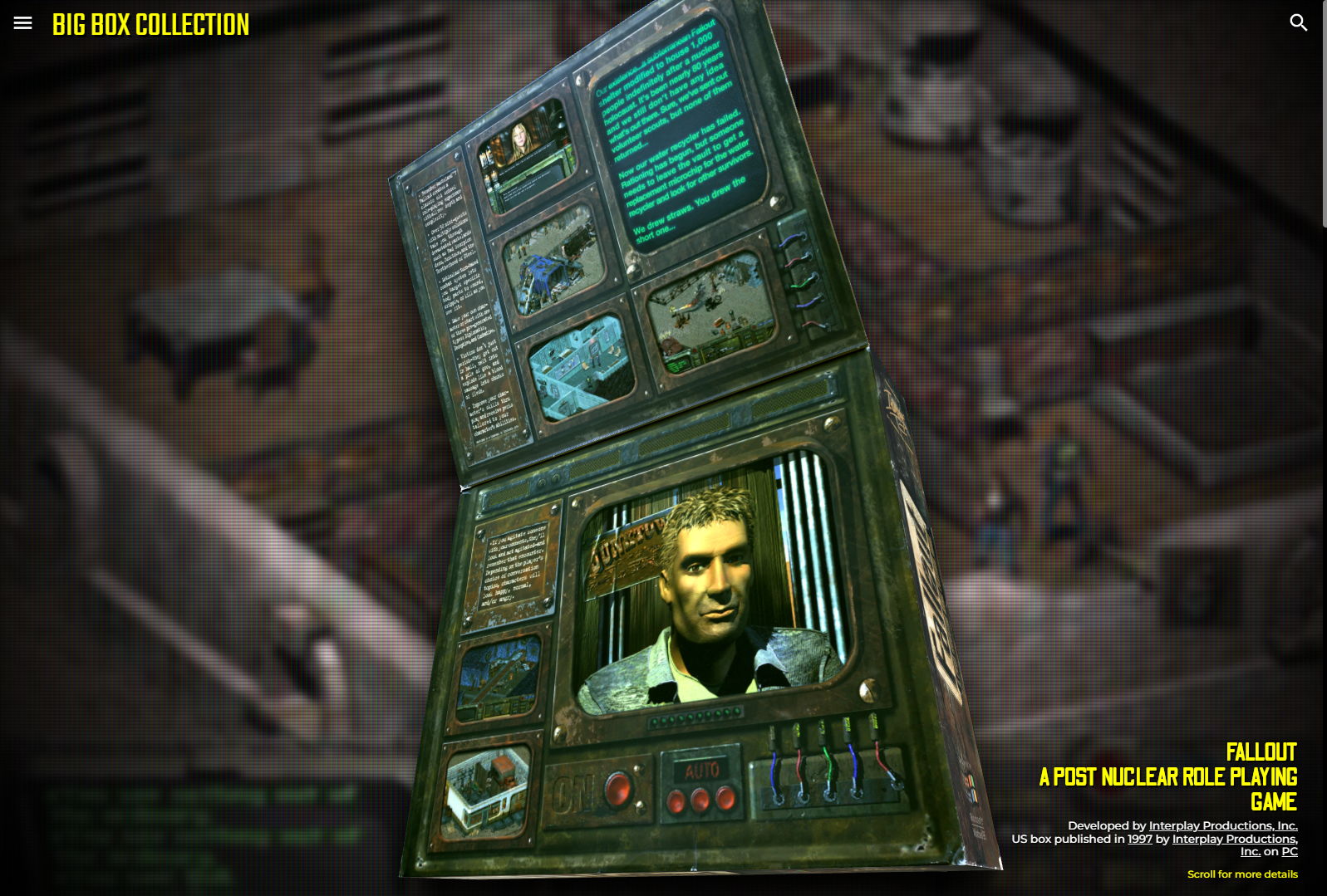 Pokud vám nestačí místní nepravidelná krabicová série a bažíte po dalším kartónovém nadělení, pravděpodobně vás zaujme stránka bigboxcollection.com, která archivuje big boxy vskutku netradičně, a to ve formě plně rotovatelných 3D náhledů.