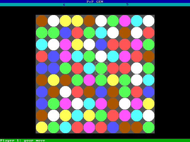 Pvpgem je herní novinka pro DOS, jde o variaci na populární "spoj 3" žánr. Dva hráči se utkají na kolbišti složeném z pestrobarevných herních kamenů, úkolem je označit kámen, tím ho odstranit, a doufat, že v následně vzniklé konfiguraci herního pole bude nějaká ta trojice (čtveřice, pětice ...) kamenů stejné barvy. Pokud ano, obdržíte příslušný počet bodu. Vyhrává hráč, který jako první dosáhne 25 bodů.