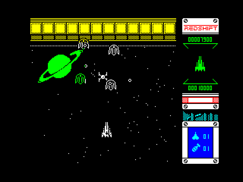 Redshift je remakem staršího titulu Galaxian III (1992), z původního líného vzoru ovšem zbyl jen grafický styl, technické zpracování je o galaxii jinde. Hardwarové nároky jsou pochopitelně krvavé, bez 128kB RAMky to nepůjde ;)