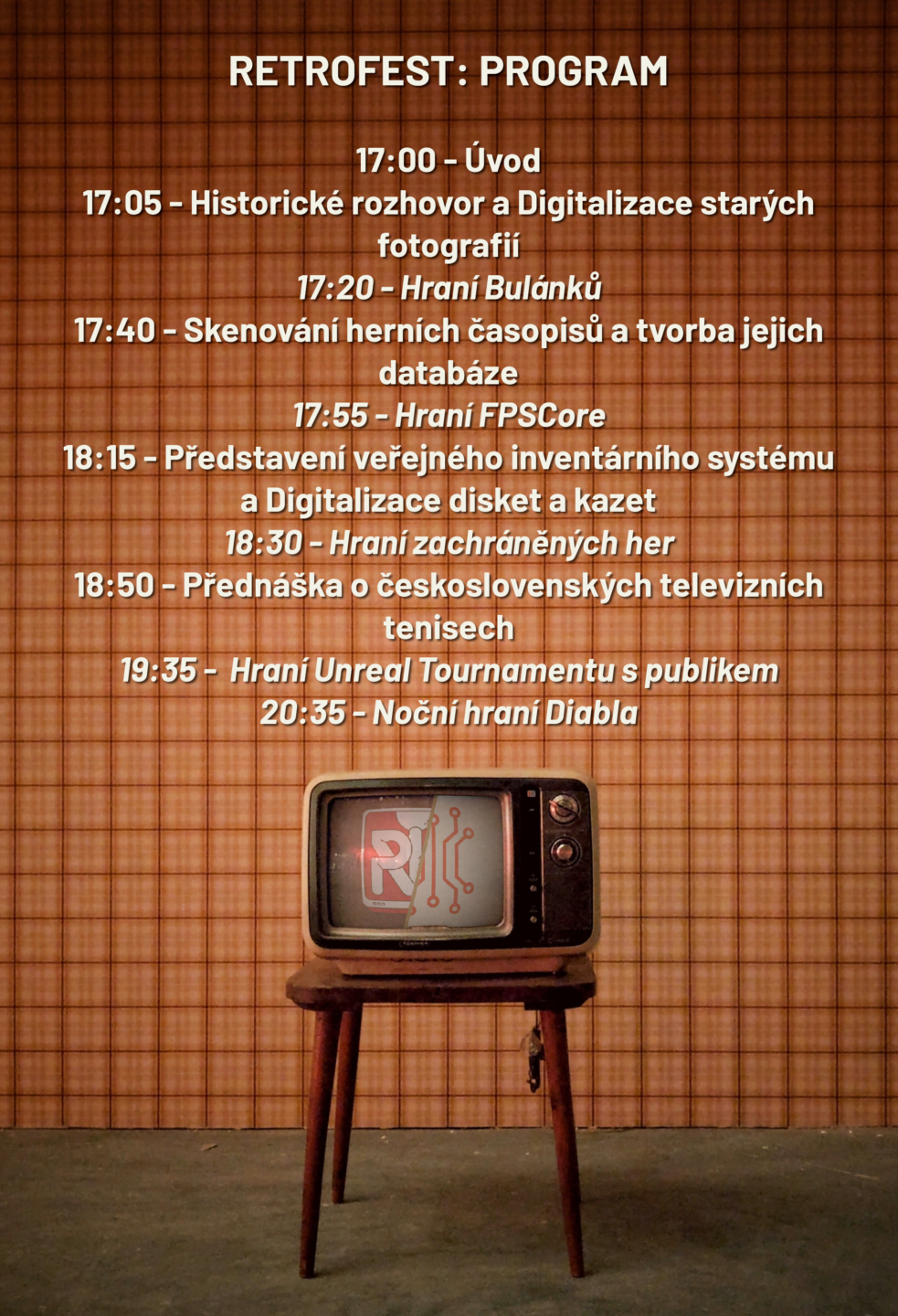 Můžete se těšit na přednášku o Československých televizních tenisech, na pařbu Unreal Tournamentu s publikem, na popis našich archivačních snah, včetně ohlášení několika novinek v rámci archivu, a na hraní více či méně známých her z našich luhů a hájů!