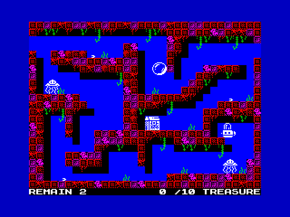 Ponořte se do hloubek oceánů planety Atlantis a pátrejte v ruinách zničených měst po ztracených pokladech. Tedy v případě, že se zvládnete dostat za druhou medúzu na první obrazovce. Já to nedokázal. Především proto, že detekce kolizí neřeší tvar objektu, ale bere nejspíš v potaz jen celé 8x8 políčko, na kterém se část objektu nachází. Jak mám hergot vytušit, jestli tam ten pixel rezervy ještě mám, nebo už ne?!