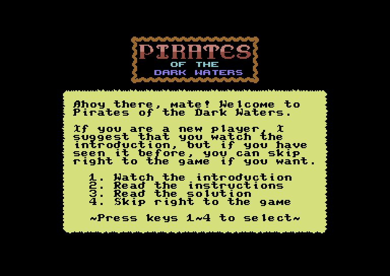 The Pirates of Dark Waters V2, přeleštěná textovka pro Commodore 64