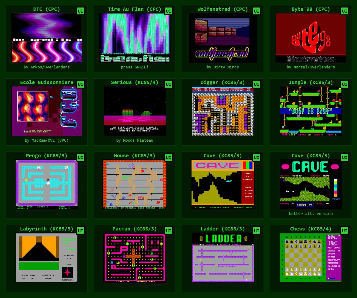 Web vám tak na jedno snadné a bezbolestné kliknutí zprostředkuje mocný závan nostalgie. Za sebe mohu doporučit např. Boulderdash (CPC), Arkanoid (CPC) či Bruce Lee (a zase CPC!). No a samozřejmě vše pro výše zmíněný Robotron KC 85, k tomu se člověk jen tak nedostane. Mimochodem - KC znamená Kleincomputer.