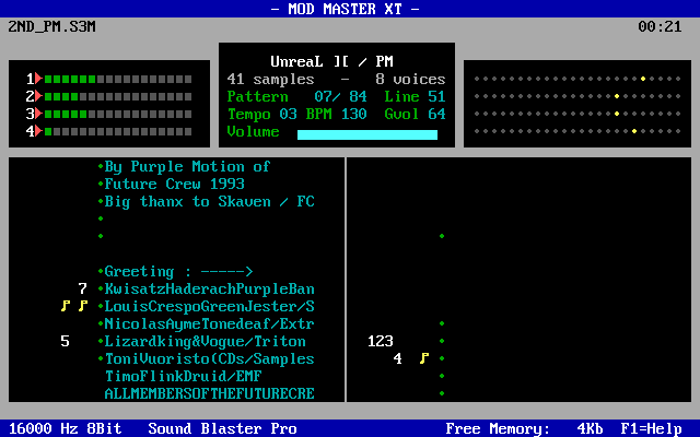 Do jisté míry lze přehrát i legendární 2ND_PM.S3M - při 16kHz jede playback bez problémů, potíž je, že kvůli nedostatku paměti nelze načíst všechny samply. Konečně důvod, proč na turboXTčku řešit EMS :)